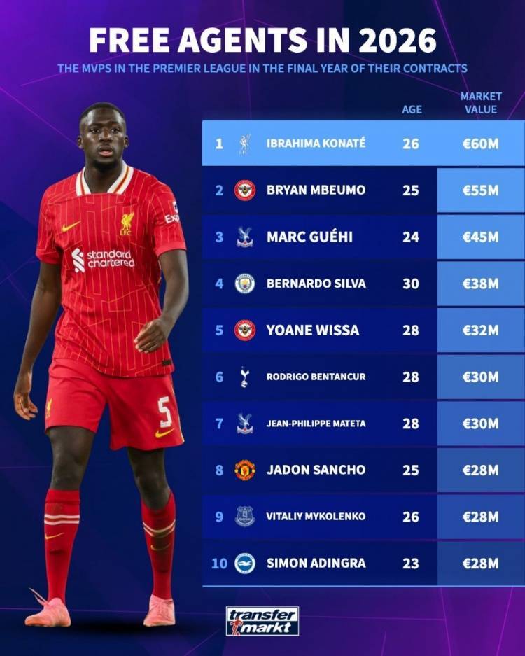直播吧7月3日讯 《转会市场》列出了已经进入合同年的英超球员身价情况,科纳特压姆贝莫居首。